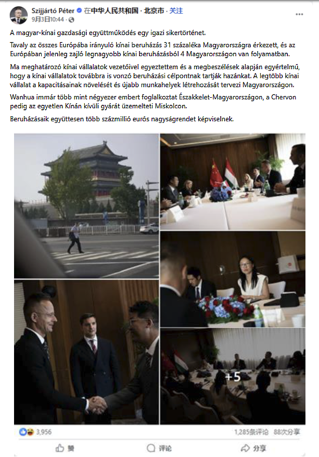 2025年9月3日,匈牙利外交與對外經(jīng)濟部長西雅爾多在北京參加完紀念中國人民抗日戰(zhàn)爭暨世界反法西斯戰(zhàn)爭勝利80周年閱兵活動后,同在匈牙利投資的中國主要公司領導人進行了會談。